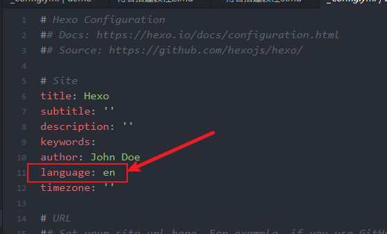 修改站点配置文件_config.yml,默认语言是 en 。