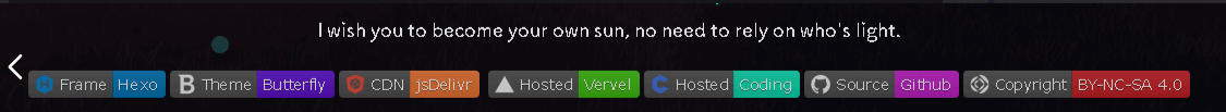 1 | custom_text: I wish you to become your own sun, no need to rely on who's light.<p><a target="_blank" href="https://hexo.io/"><img src="https://img.shields.io/badge/Frame-Hexo-blue?style=flat&logo=hexo" title="博客框架为Hexo"></a> <a target="_blank" href="https://butterfly.js.org/"><img src="https://img.shields.io/badge/Theme-Butterfly-6513df?style=flat&logo=bitdefender" title="主题采用butterfly"></a> <a target="_blank" href="https://www.jsdelivr.com/"><img src="https://img.shields.io/badge/CDN-jsDelivr-orange?style=flat&logo=jsDelivr" title="本站使用JsDelivr为静态资源提供CDN加速"></a> <a target="_blank" href="https://vercel.com/ "><img src="https://img.shields.io/badge/Hosted-Vervel-brightgreen?style=flat&logo=Vercel" title="本站采用双线部署,默认线路托管于Vercel"></a> <a target="_blank" href="https://vercel.com/ "><img src="https://img.shields.io/badge/Hosted-Coding-0cedbe?style=flat&logo=Codio" title="本站采用双线部署,联通线路托管于Coding"></a> <a target="_blank" href="https://github.com/"><img src="https://img.shields.io/badge/Source-Github-d021d6?style=flat&logo=GitHub" title="本站项目由Gtihub托管"></a> <a target="_blank" href="http://creativecommons.org/licenses/by-nc-sa/4.0/"><img src="https://img.shields.io/badge/Copyright-BY--NC--SA%204.0-d42328?style=flat&logo=Claris" title="本站采用知识共享署名-非商业性使用-相同方式共享4.0国际许可协议进行许可"></a></p> |
